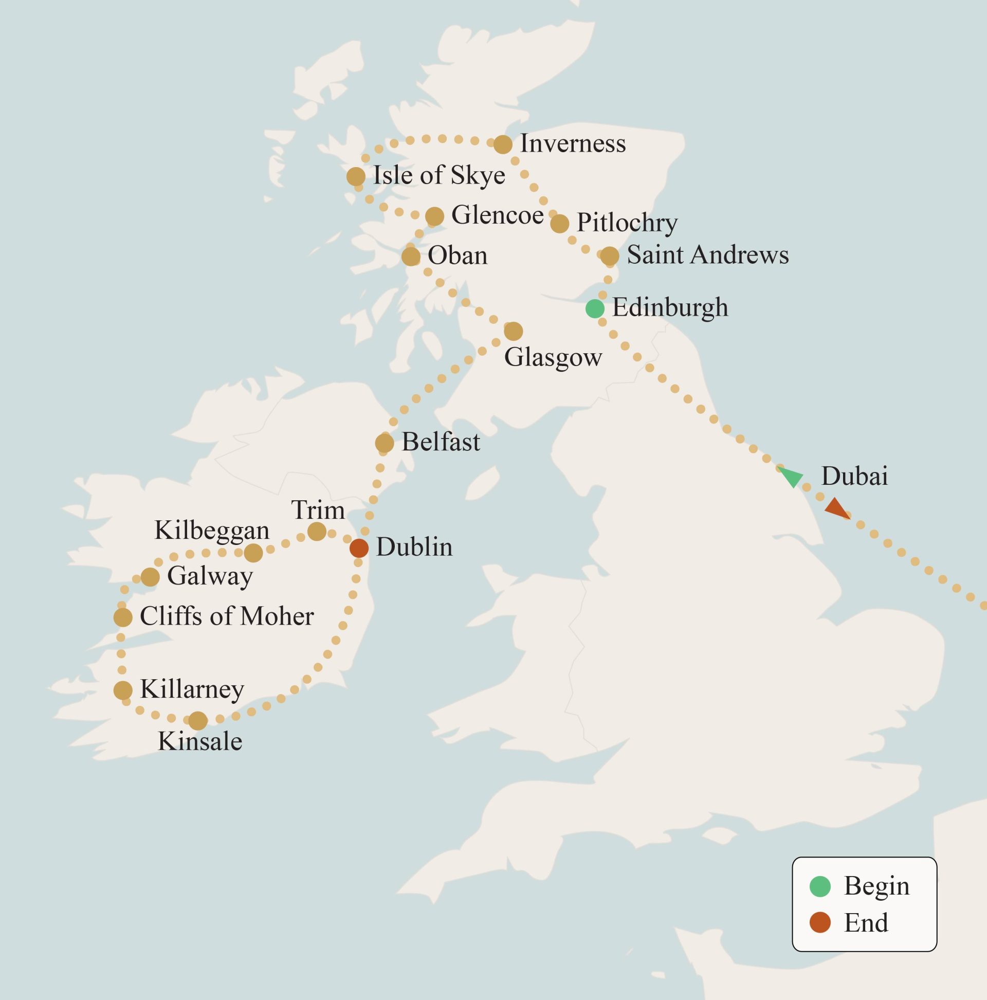Our starting point is the great city of Edinburgh, a city renowned for its heritage, culture, and festivals, before we travel to places such as Pitlochry, Inverness – home of the mythical Loch Ness monster and Glasgow. We join the ferry to Belfast, our entry point into Ireland. From here, we explore Galway, the capital city of Dublin, Killarney and more!